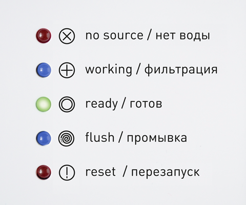 По заказу компании Prio / Новая Вода, ведущего российского разработчика и производителя фильтров для воды, агентством Omnibus был разработан набор пиктограмм для инновационного прибора, разработанного компанией – автоматического помпового блока для систестем обратного осмоса. Пиктограммы являются частью пользовательского интерфейса прибора и иллюстрируют пять режимов работы / состояний блока.