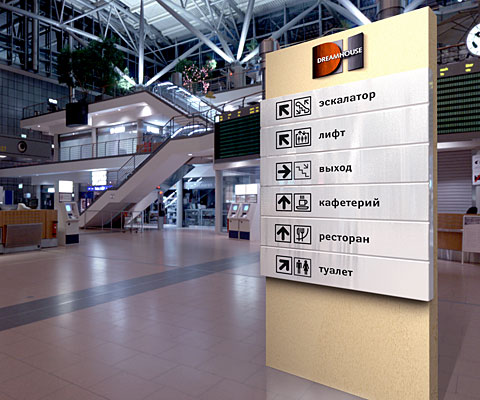 Разработка комплексной системы визуальной навигации для торгового центра DreamHouse на Рублевском шоссе включала в себя дизайн серии пиктограмм и дизайн объемных навигационных конструкций для помещения торгового центра и прилегающей территории.