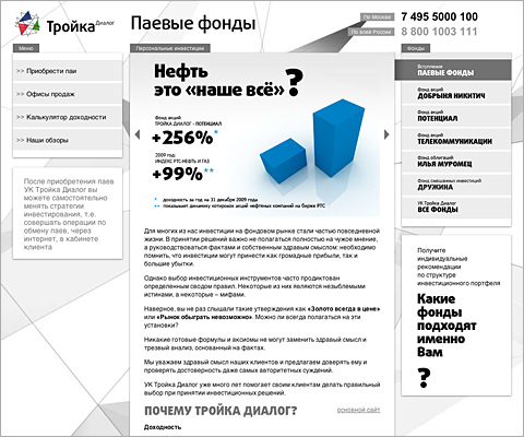 По заказу программно-стратегического агентства «Офис 24» агентством Omnibus были созданы HTML-шаблоны страниц и осуществлено программирование интерактивных элементов промо-сайта, приуроченного к рекламной кампании паевых инвестиционных фондов компании «Тройка-Диалог». В рамках работы созданные шаблоны и скрипты подверглись тщательному тестированию для корректного отображения и работы с самыми разнообразными браузерами.